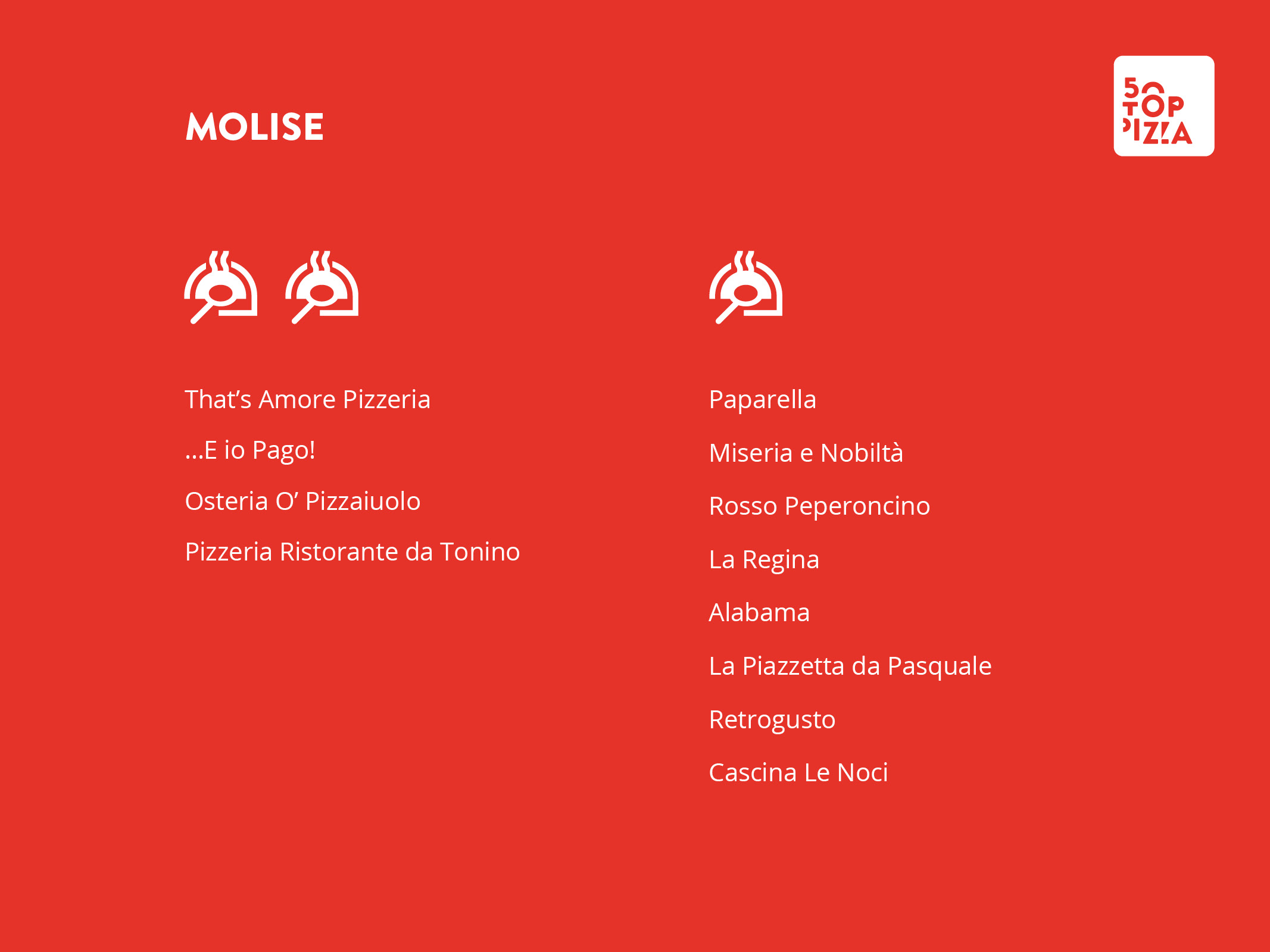 Molise: 4 pizzerie due forni; 8 pizzerie un forno; totale 12