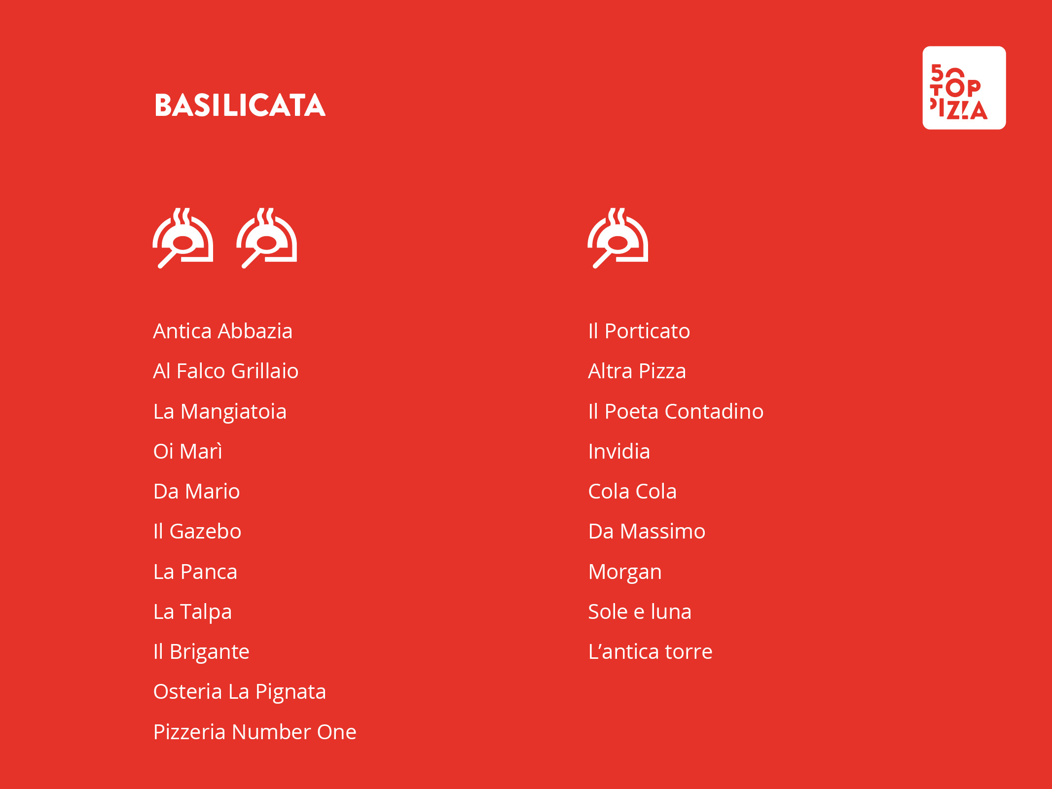 Basilicata: 11 pizzerie due forni; 9 pizzerie un forno; totale 20