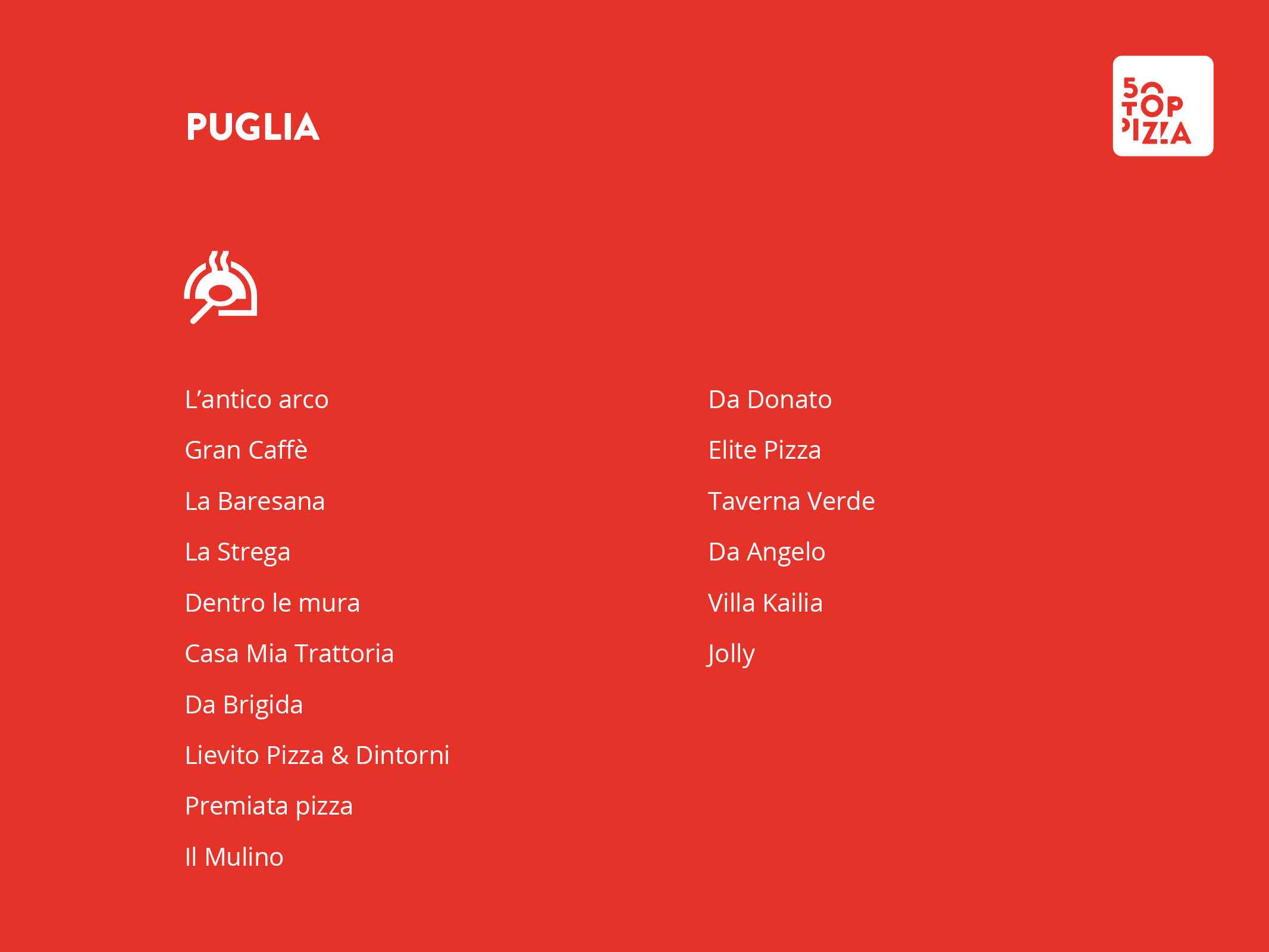Puglia: 14 pizzerie due forni; 16 pizzerie un forno; totale 30
