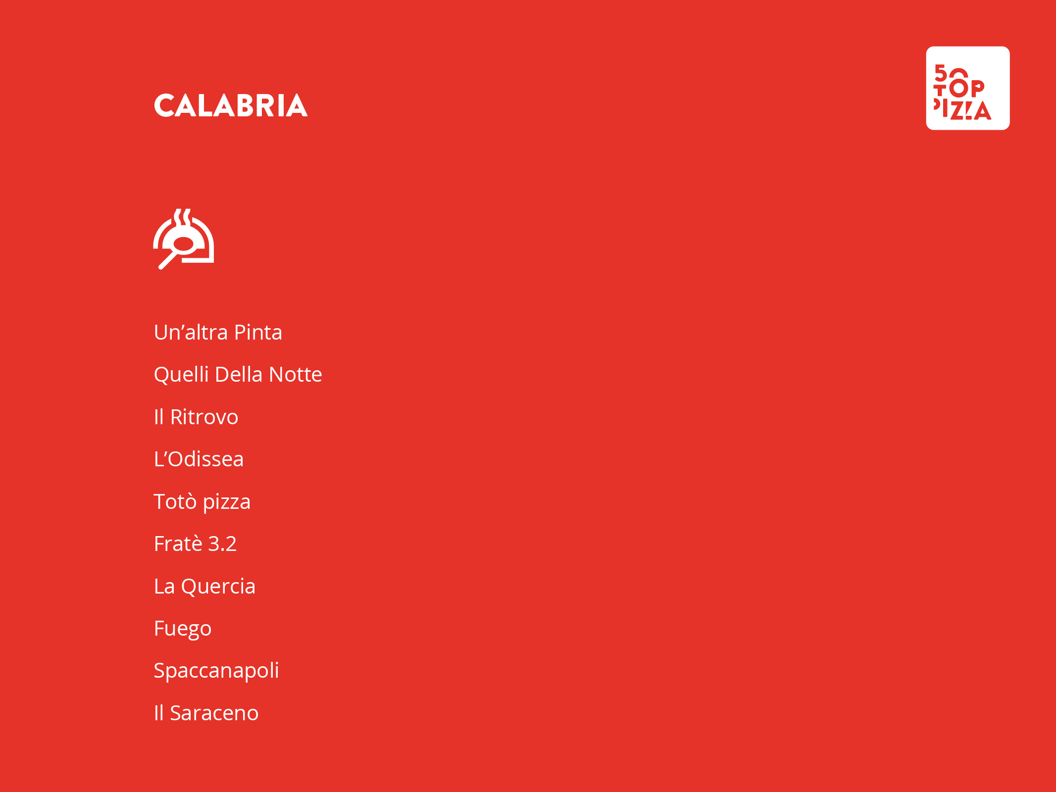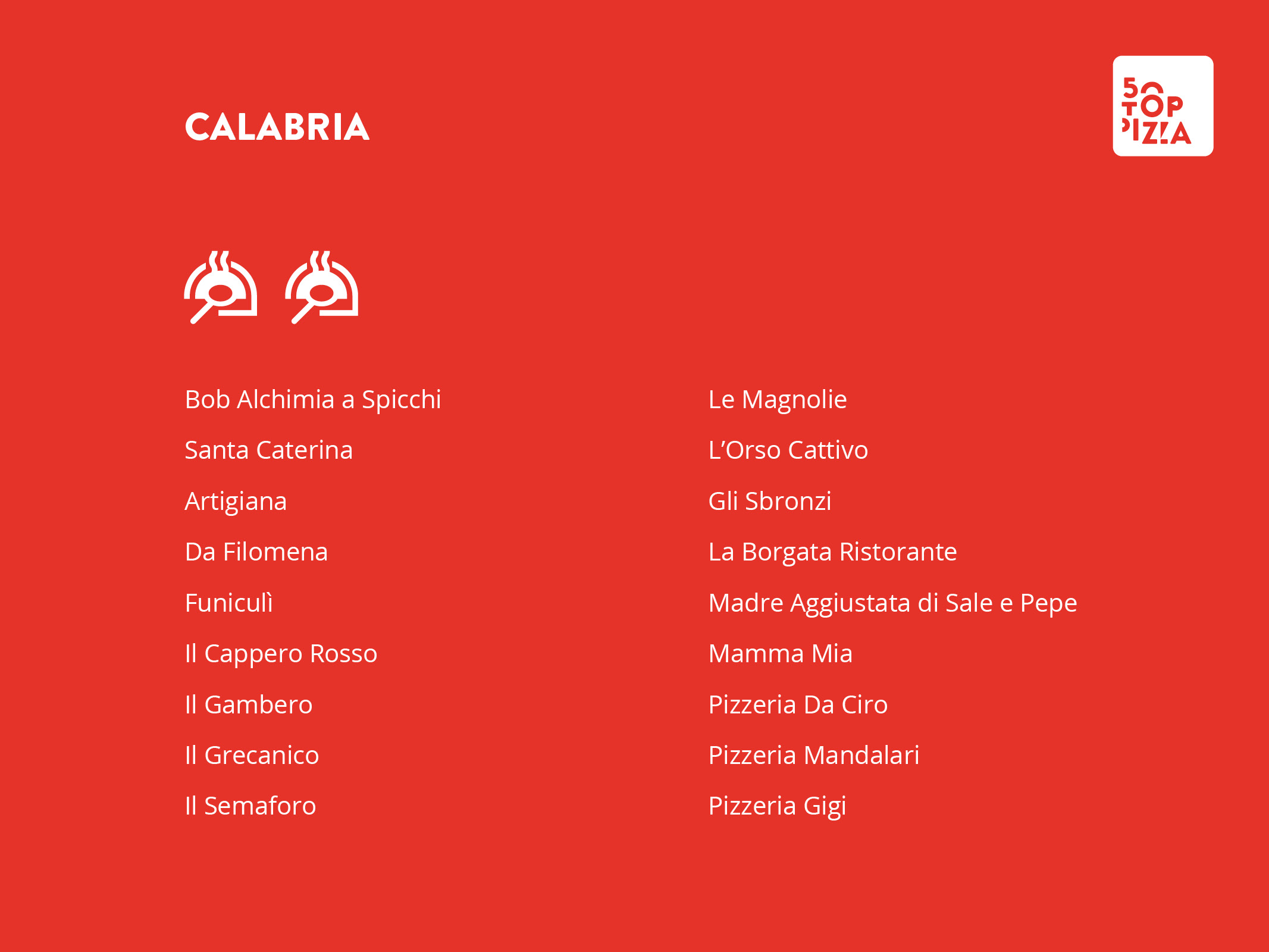 Calabria: 18 pizzerie due forni; 10 pizzerie un forno; totale 28