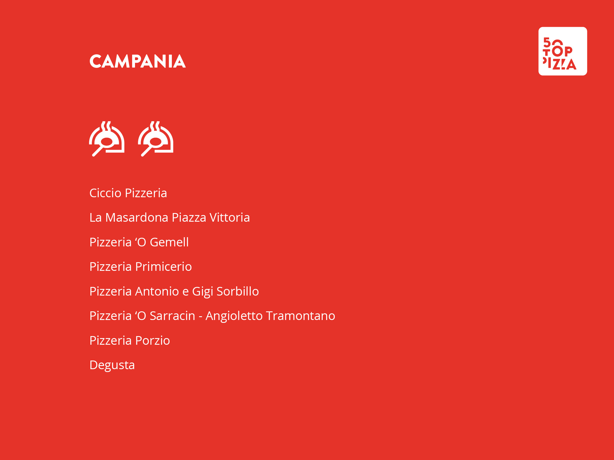 Campania: 60 pizzerie a due forni; 49 pizzerie a un forno; totale 109
