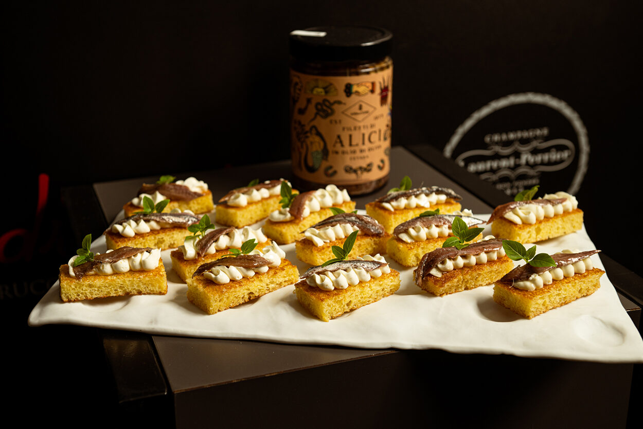 E poi i finger food di Lino Scarallo e del suo team. Un tripudio di accostamenti particolari e di gusto. Tra le tante tipologie offerte agli invitati, lo chef stellato padrone di casa ha proposto: Pane burro e alici di Cetara Armatore; panino friarielli TerraViva, tracchia marinata, peperone crusco; ventresca Armatore, cipolla marinata, salsa agrodolce; tonno Armatore, percoca e vino rosso; polpo e pesto di basilico, con pomodoro secco Robo; frittatina di pasta con pomodoro TerraViva; ricotta di fuscella Latteria Sorrentina, con spuma di peperone ripieno.