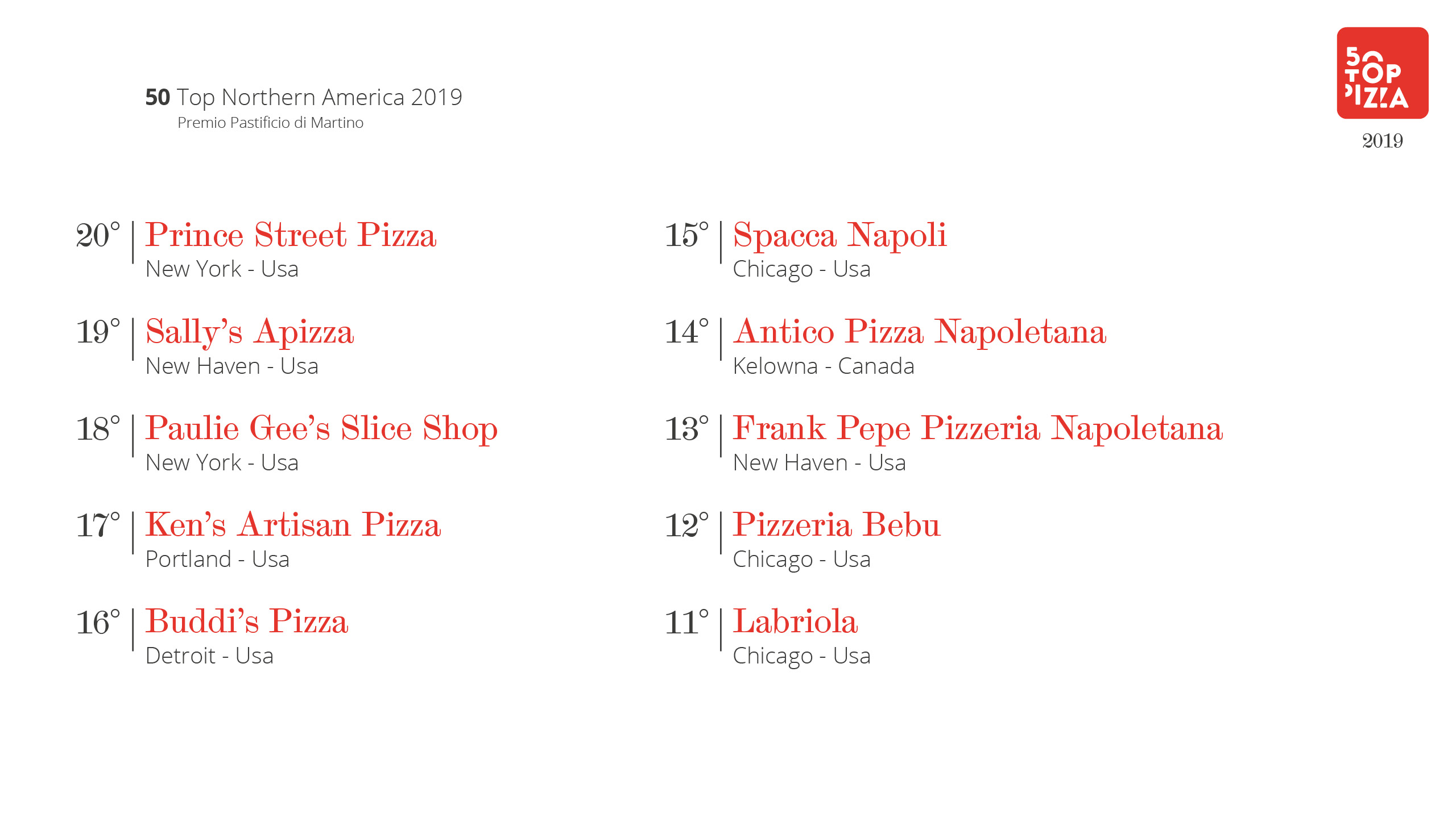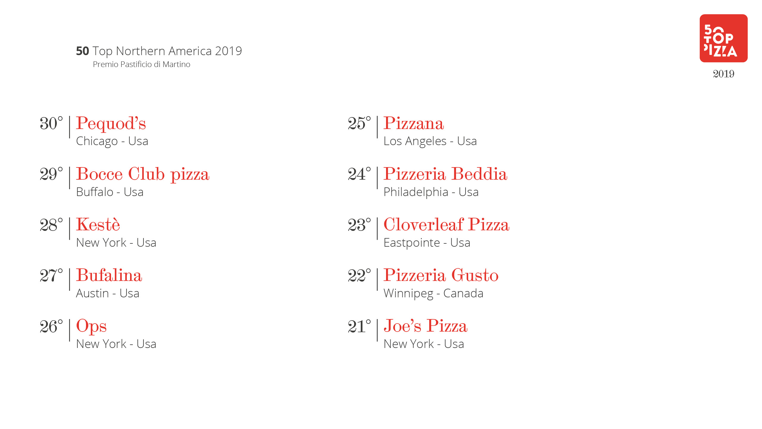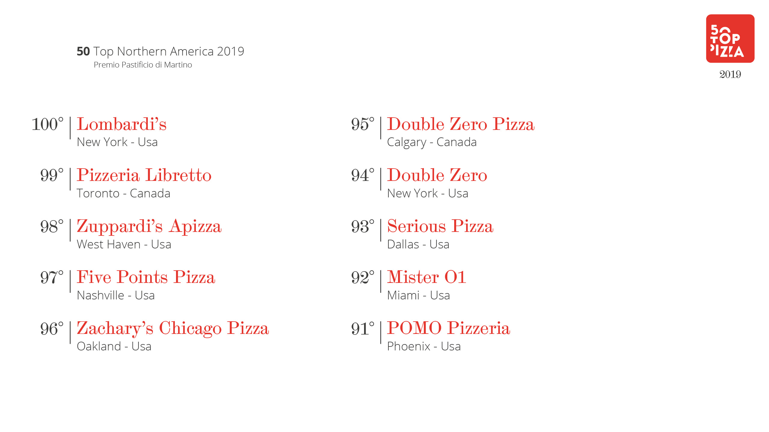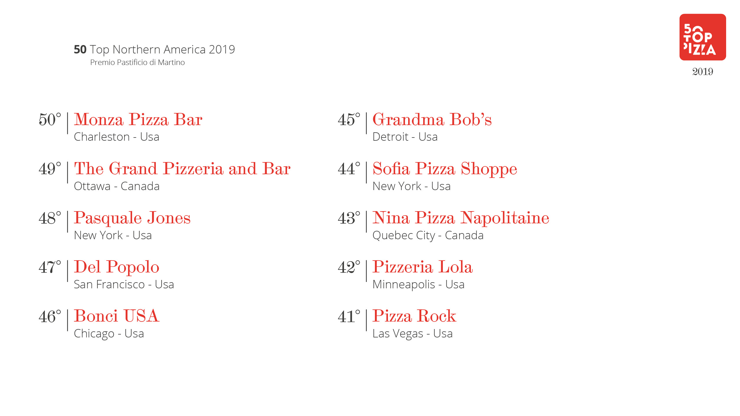 Classifica 50 Top Northern America 2019 – Premio Pastificio di Martino