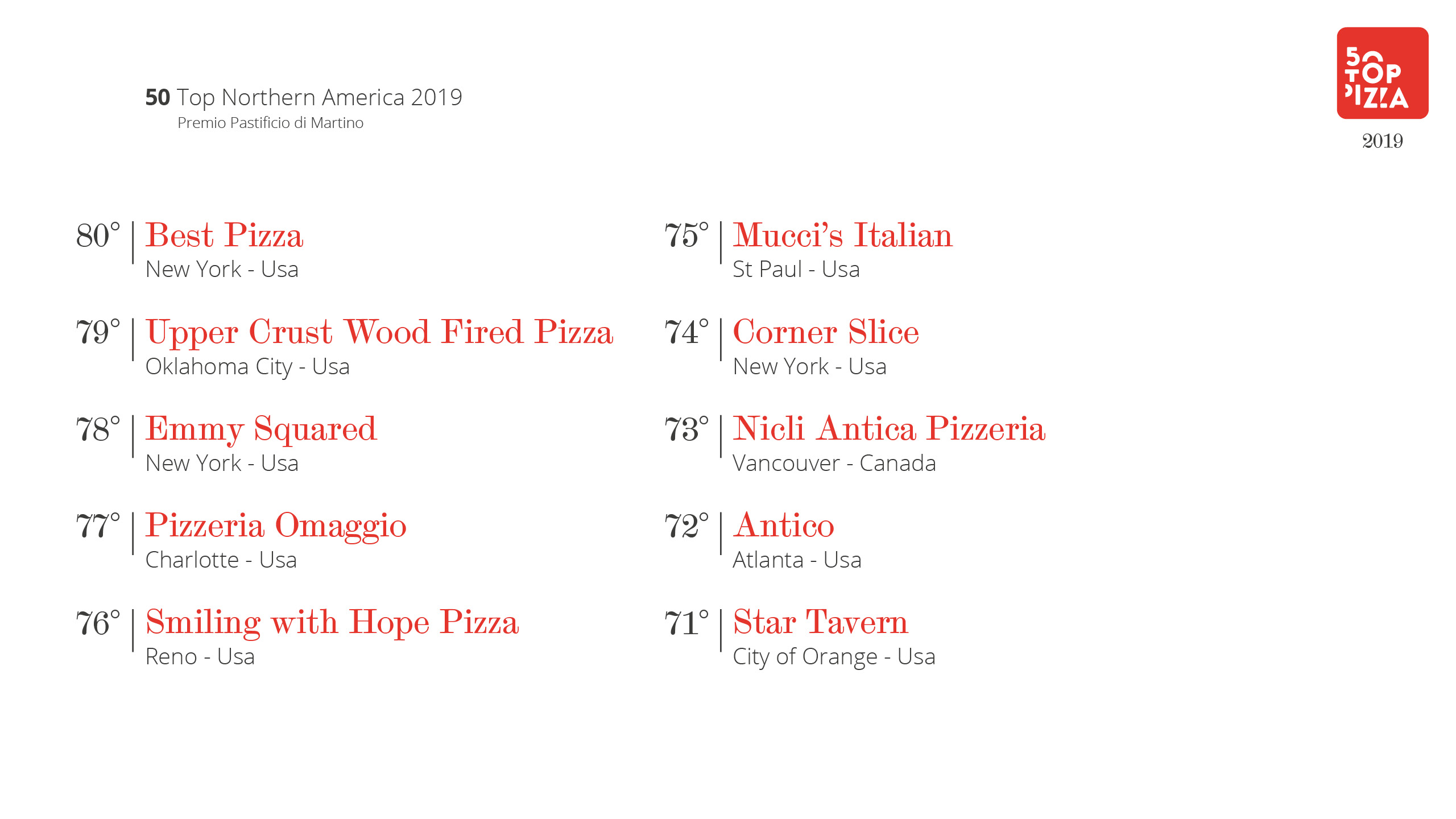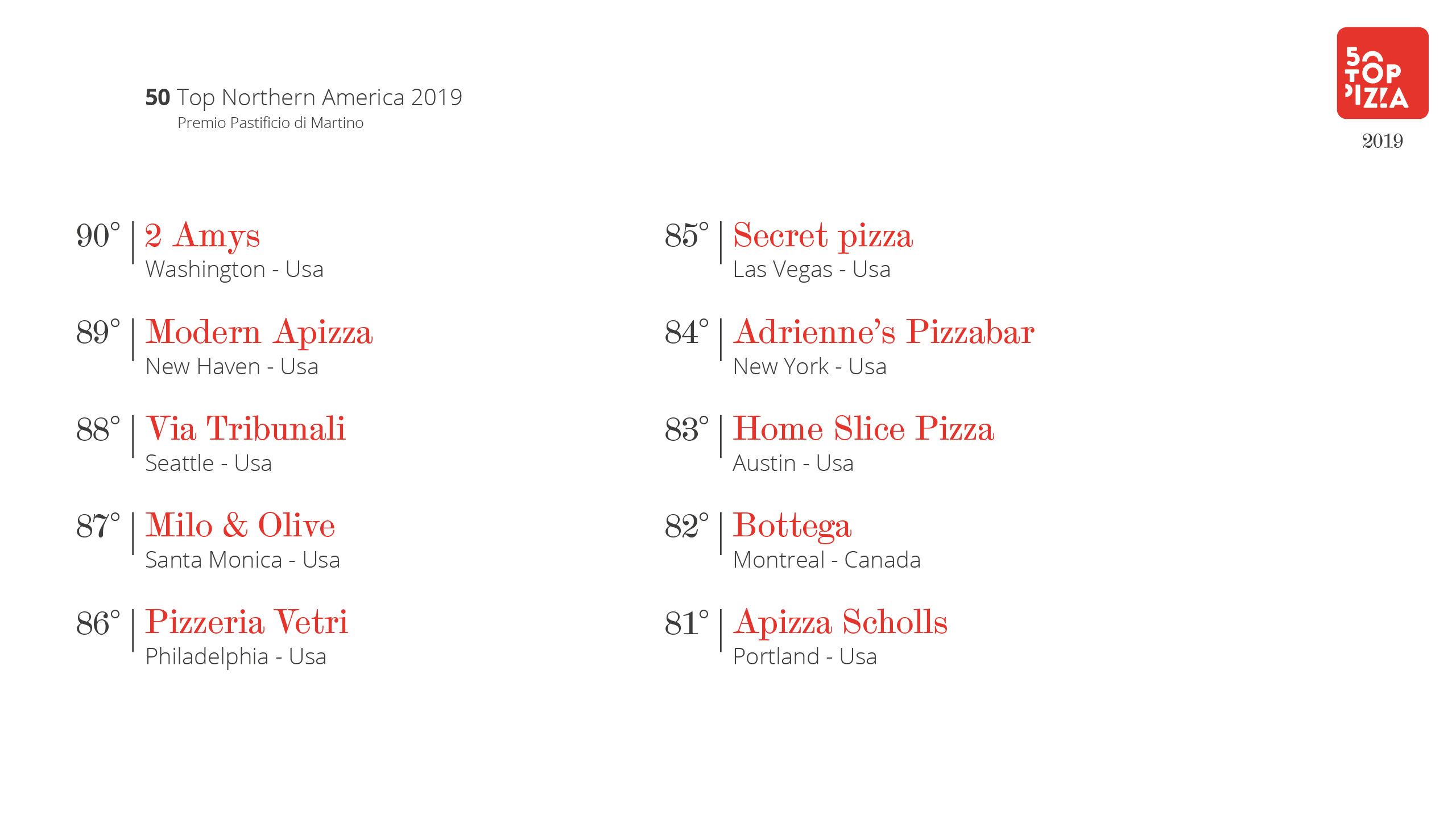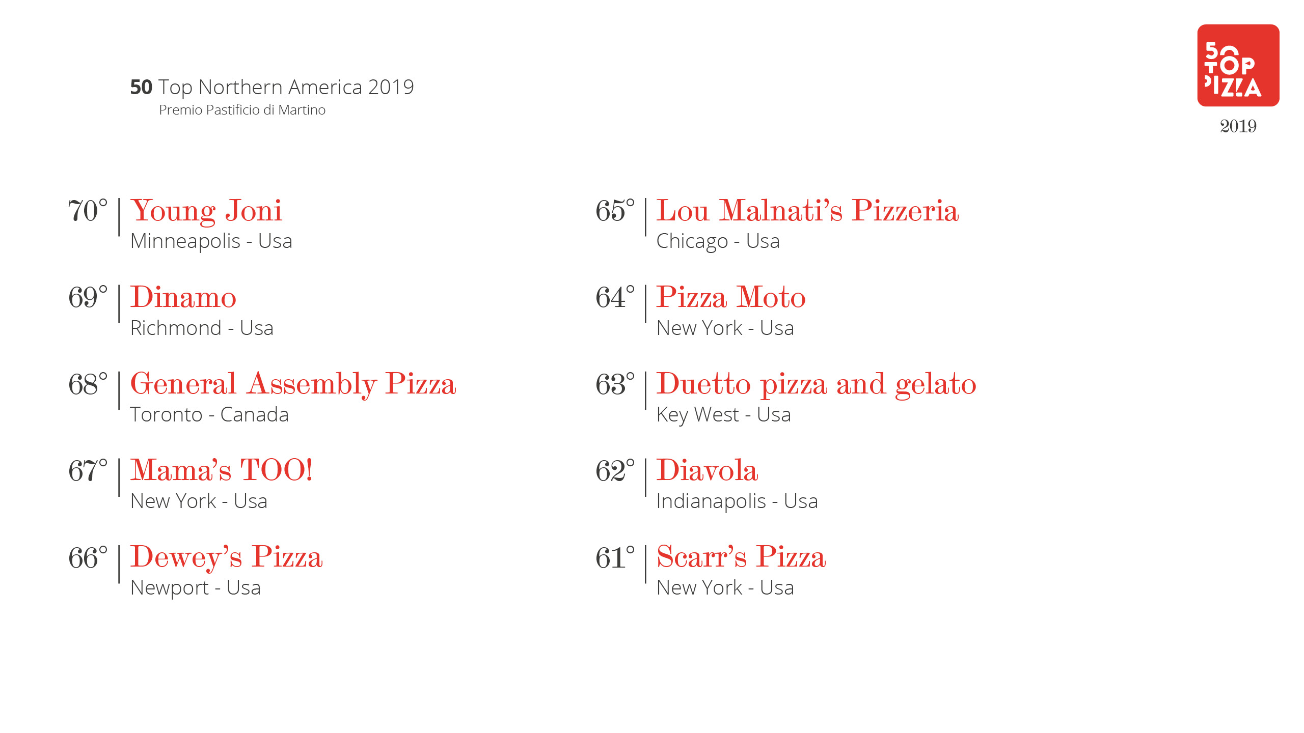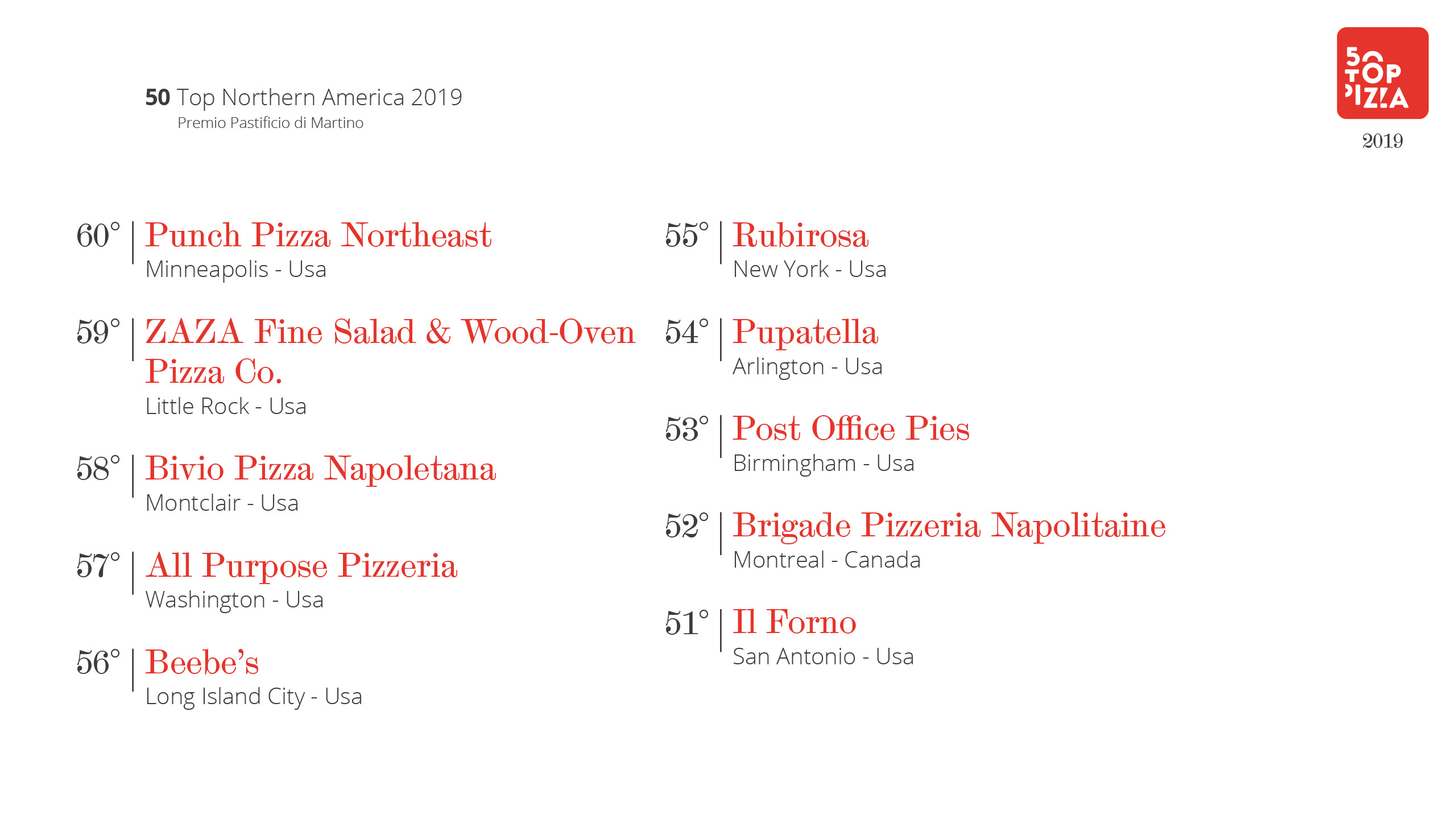 Classifica 50 Top Northern America 2019 – Premio Pastificio di Martino