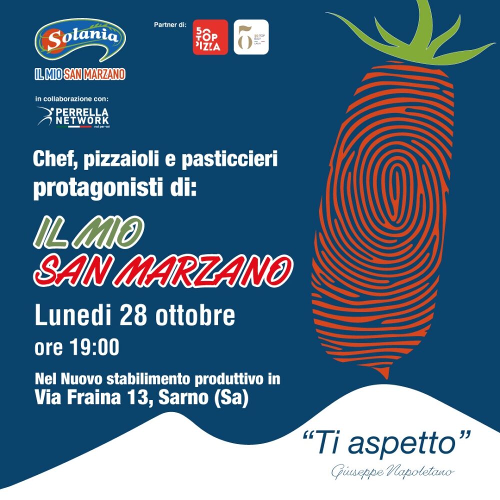 Si terrà lunedì 28 ottobre alle ore 19.00 presso lo stabilimento di via Fraina, 13 a Sarno (SA), la 7°edizione de “Il Mio San Marzano”, il consueto evento promosso da Solania srl, azienda leader nel settore della raccolta e della trasformazione del pomodoro San Marzano, in collaborazione con Perrella Network, distributore esclusivo di Solania in Campania e Molise.