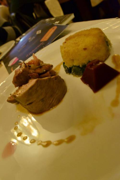 E’ stato pensato un abbinamento ideale con l’aglianico del Vulture, la carne di agnello con tortino di patate e friarielli e gelatina di aglianico: Esso, essa, essi, esagerazioni.