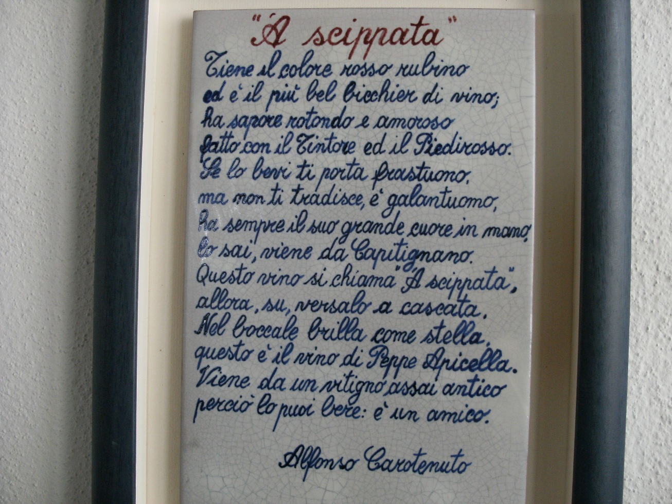 Il top aziendale è rappresentato dalla bottiglia denominata “A’ Scippata” (la strappata), assemblata con un uvaggio di Tintore e saldo