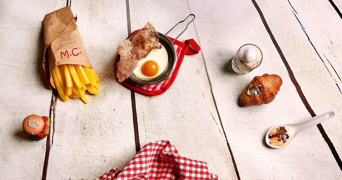 Questa preparazione nasce dal voler realizzare un brunch, dunque un pasto particolarmente abbondante consumato a metà mattinata, ispirato ad un abbraccio ideale tra Italia e Inghilterra. In questo caso, sono ricreati cibi tipici del mondo del salato, che si fondono e si trasformano in elementi che appartengono al mondo della pasticceria, esprimendosi in una chiave illusoria e estremamente innovativa.