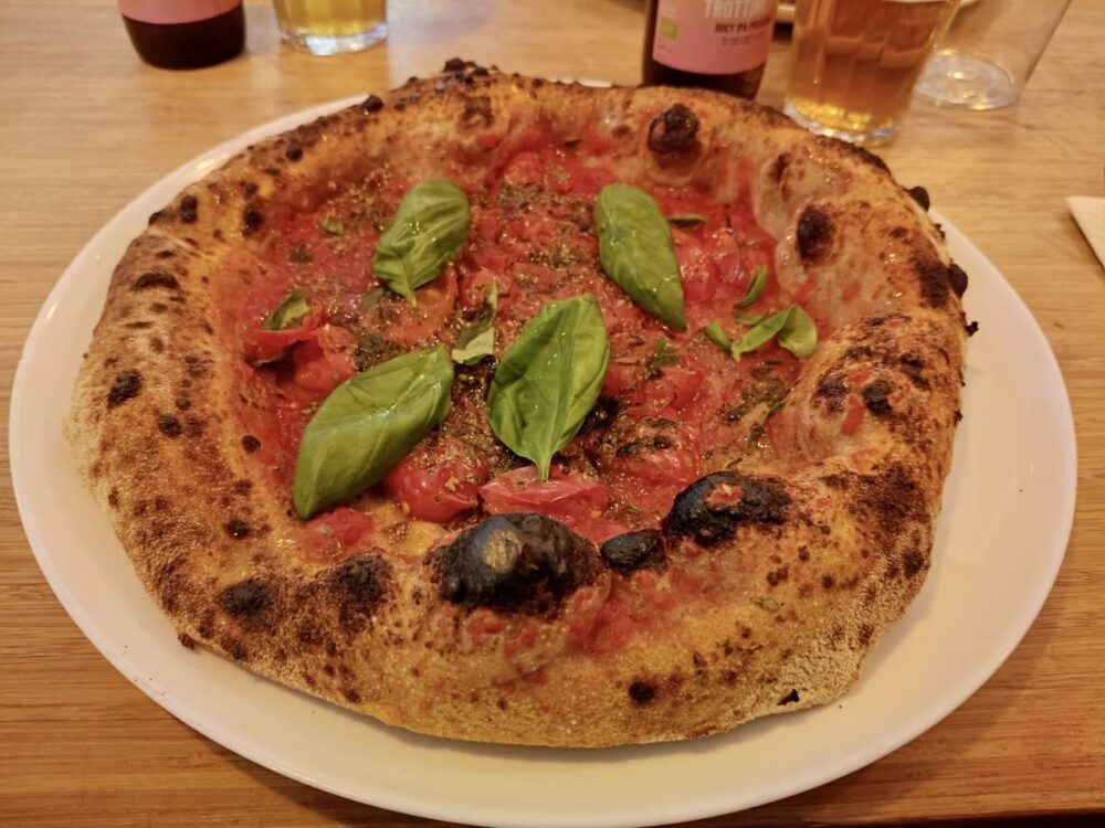 Innanzitutto va detto che l’impasto è diverso da quello che si trova normalmente in una pizzeria napoletana tradizionale, non farina bianca ma un mix di farine complete, antiche, anche di piccoli produttori belgi, con grani ben visibili, che danno alla pasta un gusto unico, originale quanto buonissimo.