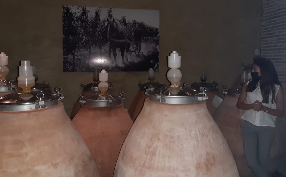 Tornando più in alto, a 250 slm, nella zona di Cori più vocata per il Nero Buono, concludiamo il giro da Marco Carpineti, il pioniere e tutt’ora l’avanguardia. La terza sorpresa è visitare una delle sue bottaie dove, nello scavare il tufo, hanno trovato una lingua di lava nerissima, probabilmente una delle più avanzate verso la pianura pontina, alla cui estremità si distinguono bene accumuli rossi ferrosi ed altri gialli di zolfo. E’ diventata una suggestiva parete che fa da cornice non solo alle botti ma anche alle anfore di tipo romano senza manici e crude (non trattate all’interno) dove affinano Nero Buono e Bellone dopo essere stati vinificati in acciaio.