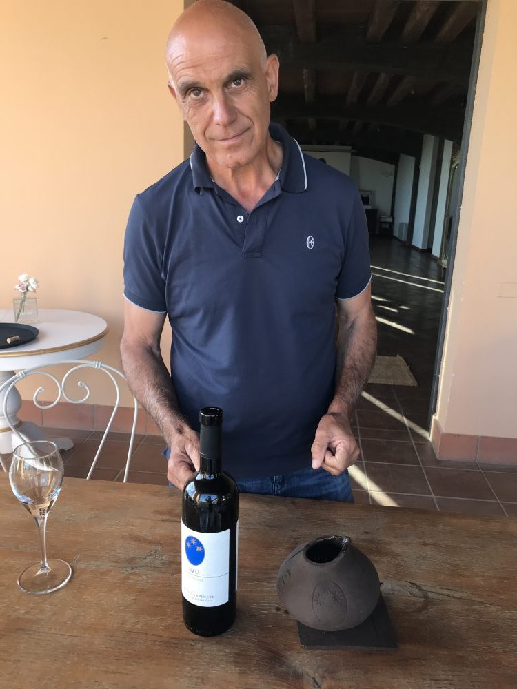 Da questi due vitigni tutto è cominciato con le etichette Capolemole (dal nome della località) bianco e rosso (quest’ultimo oggi anche con cesanese e montepulciano), vitigni che adesso sono anche il futuro della cantina, un “antico futuro” con i due Nzù (che sin corese significa “insieme”, perché il vino è convivialità – spiega Marco Carpineti – ma anche perché i due Nzù mettono insieme passato e futuro). Bellone e Nero Buono in purezza, da terre lavorate con i cavalli, fermentazione spontanea e affinamento, appunto, in anfora. Che Marco Carpineti propone di servire con una brocca in terracotta appositamente realizzata per lui da un giovane ceramista della zona, per esaltarne il legame con la terra di Cori. I suoi vini si caratterizzano tutti per la lunga persistenza sapida, è il terreno vulcanico che lascia traccia. L’azienda è biologica dal ‘94, in parte già pure biodinamica, sta lavorando sui propri lieviti autoctoni, il fabbisogno energetico è orami quasi interamente garantito dai pannelli solari.