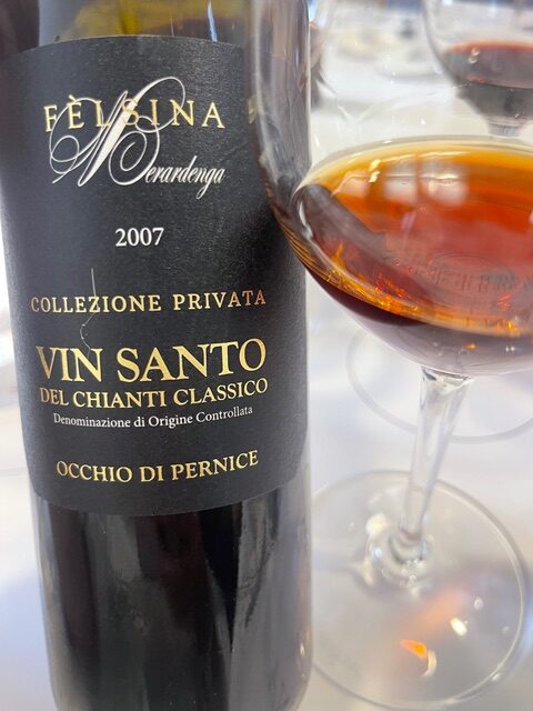 Vin Santo del Chianti Classico 2007 Occhio di Pernice appassimento naturale, dopo la pigiatura il mosto viene trasferito in caratelli sigillati di rovere. Giallo ambrato luminoso, i profumi si alternano tra dolcezza e freschezza, mallo di noce, spezie, miele, cioccolato, iodio. Una prova golosa e performante per questa bella versione di vin santo.