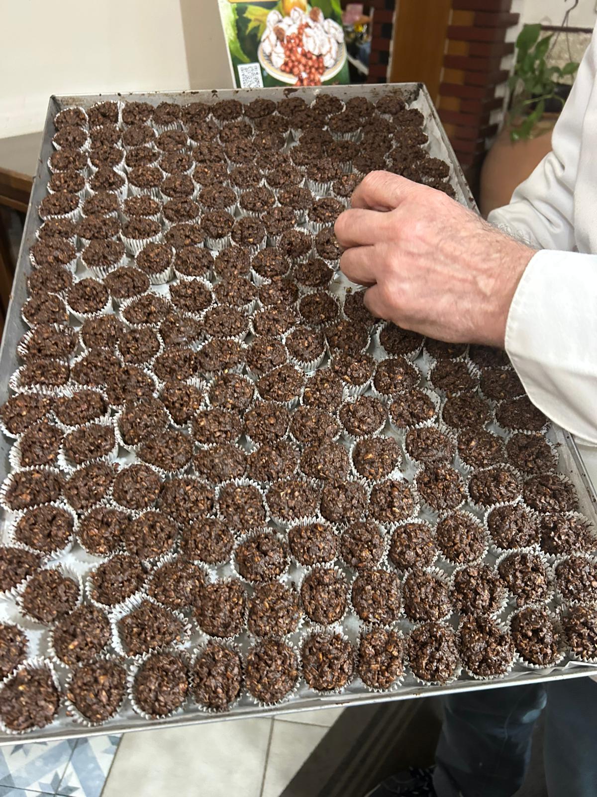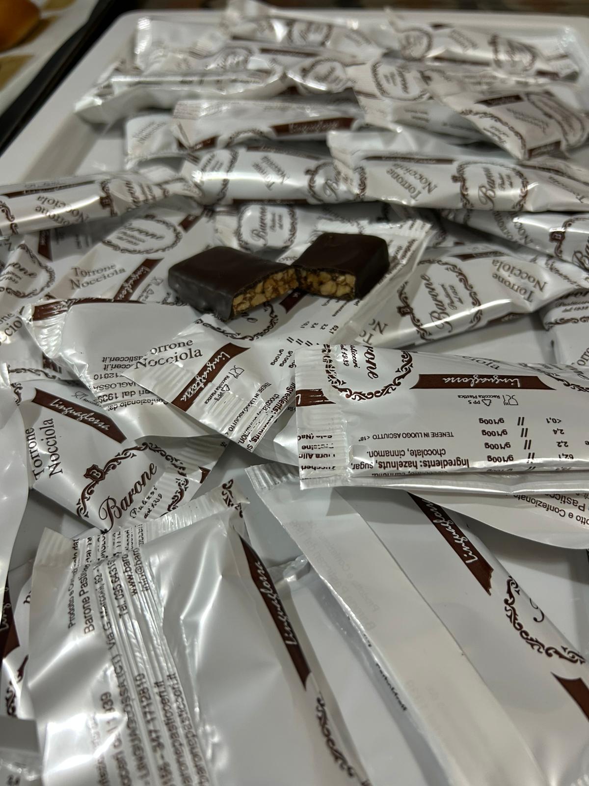 Il frutto è protagonista anche dei torroncini — croccanti di nocciola e miele ricoperti di cioccolato fondente — e dei Baronetti. Questi ultimi sono praline di cioccolato – sia fondente che al latte – e granella che, nella forma, ricordano i Baci Perugina, ma nella sostanza risultano molto più essenziali: un composto di soli due ingredienti, lavorati rigorosamente a mano, anzi “con i rebbi della forchetta”, come precisa Nino.