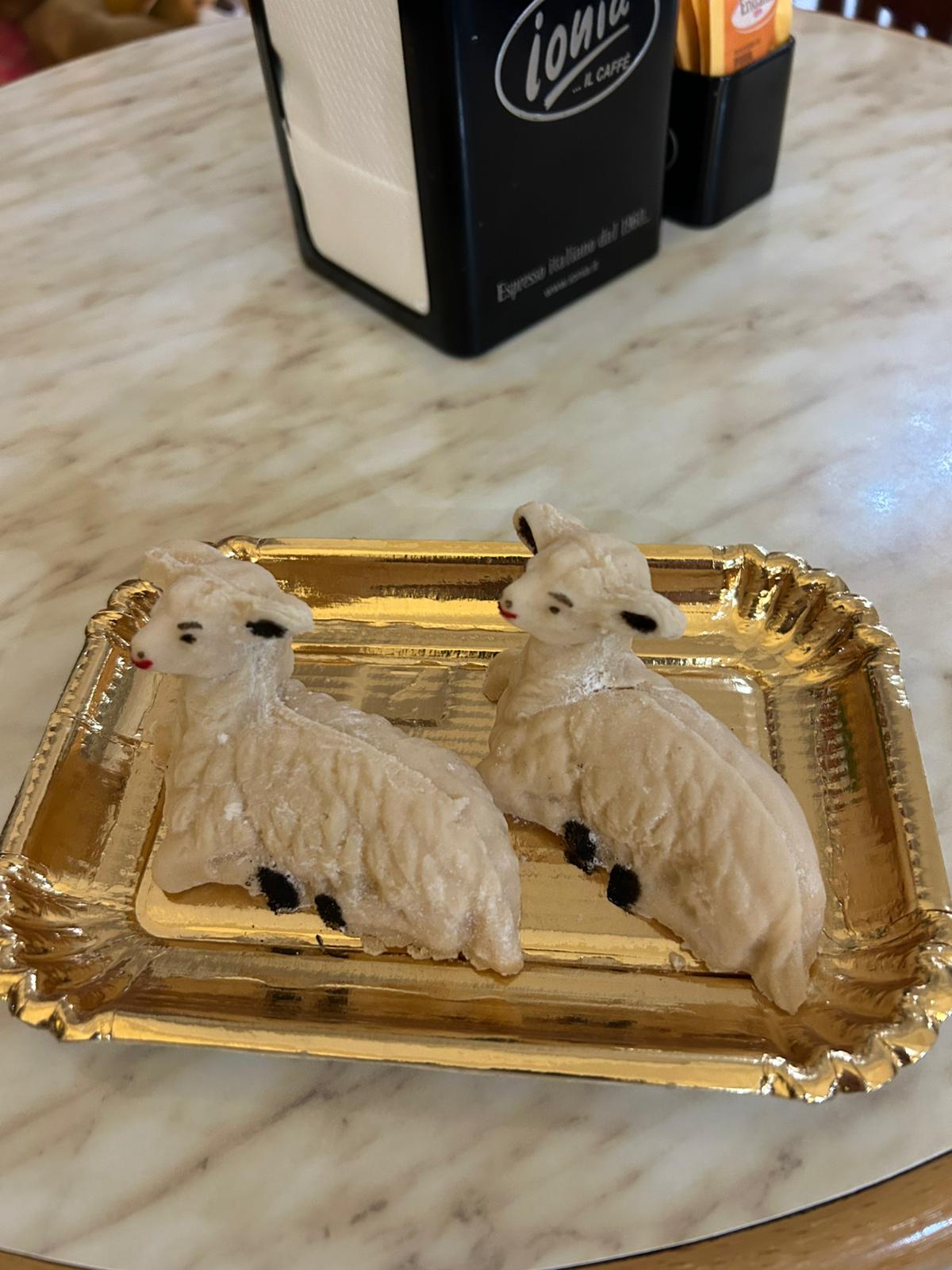 Dal laboratorio esce naturalmente anche la pasta di mandorle, realizzata a regola d’arte, sia nella versione classica sia in quella aromatizzata all’arancia. Nel periodo pasquale, l’agnello di pasta reale — un tempo dono simbolico che accompagnava l’anello di fidanzamento o altri gioielli destinati alle future spose — racconta tradizioni diffuse in tutta la Sicilia, al pari della frutta martorana e dei cannoli.