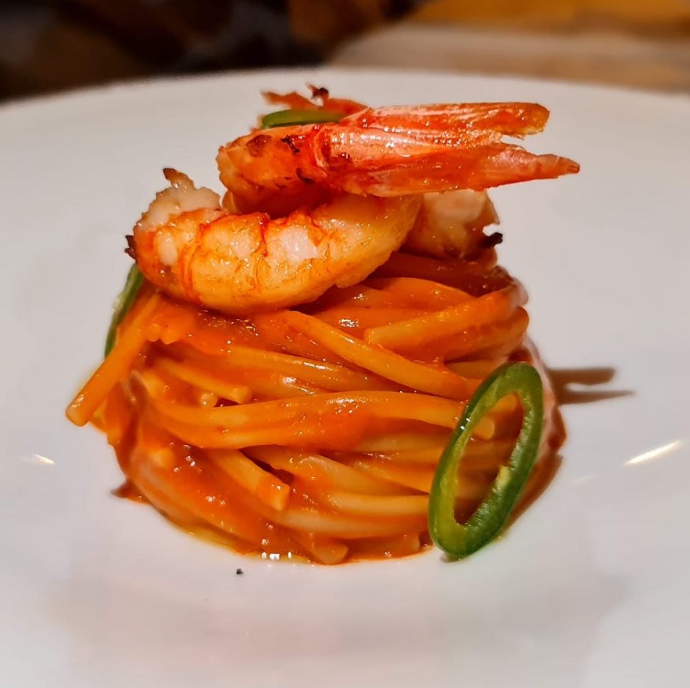 Tombon, linguine con gamberi di Mazara