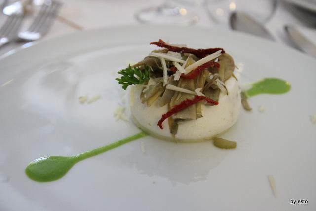 Flan di ricotta di bufala D.O.P. con julienne di carciofi , pomodoro secco, e pecorino di Moliterno.