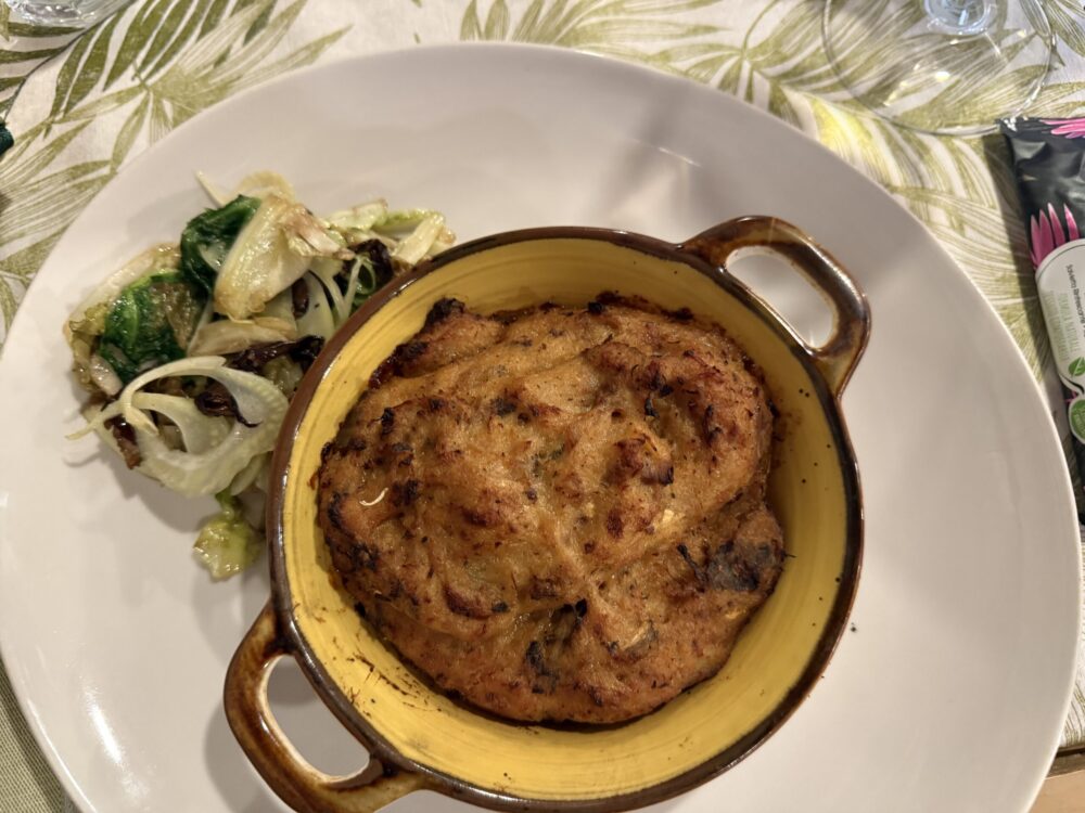 Il baccalà viene dissalato, stufato lentamente con cipolla, pane raffermo, formaggio e pepe, poi passato in forno fino a formare una crosticina dorata e profumata. È uno di quei piatti che restano nella memoria, capaci di evocare casa, viaggi e ricordi in un solo boccone.
