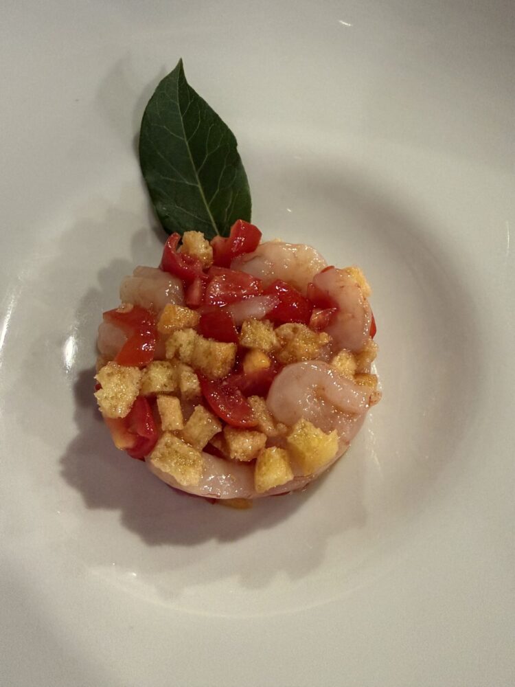 Per iniziare, La Siciliana, gamberi crudi, pomodori datterini, pane tostato e olio extravergine di Valnogaredo. Un antipasto sorprendente, fresco e profumato, che spingeva a ogni assaggio.