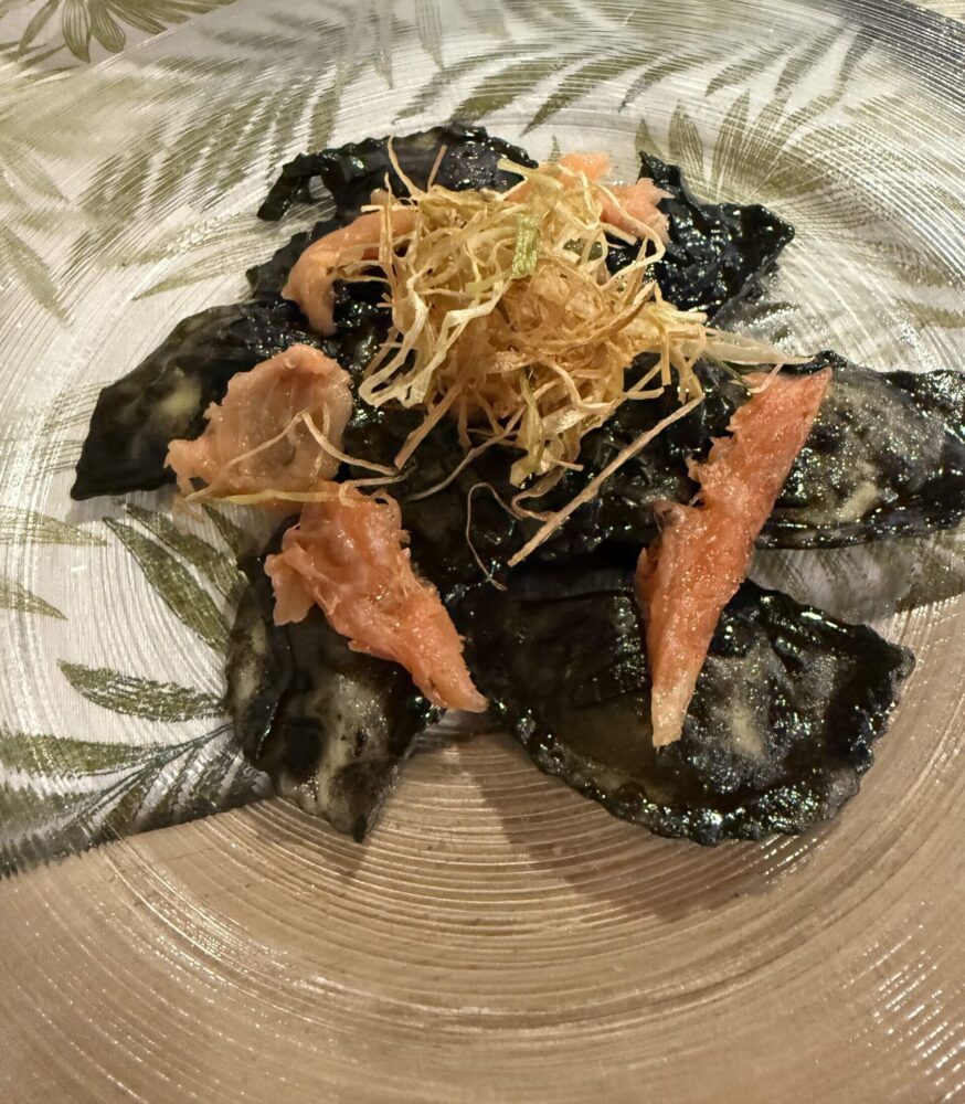 Si comincia con una mezza luna nera ripiena di ricotta e salmone affumicato, con porro fritto, per poi passare a un secondo che racconta il mare, seppioline “scarpetta”, una varietà locale di piccolissime seppioline, poco conosciute e spesso snobbate perché richiedono tempi lunghi di montatura e grande manualità, insieme a totanetti dell’Adriatico con una base di zucca e radicchio, dove sapori e colori trovano un equilibrio sorprendente.