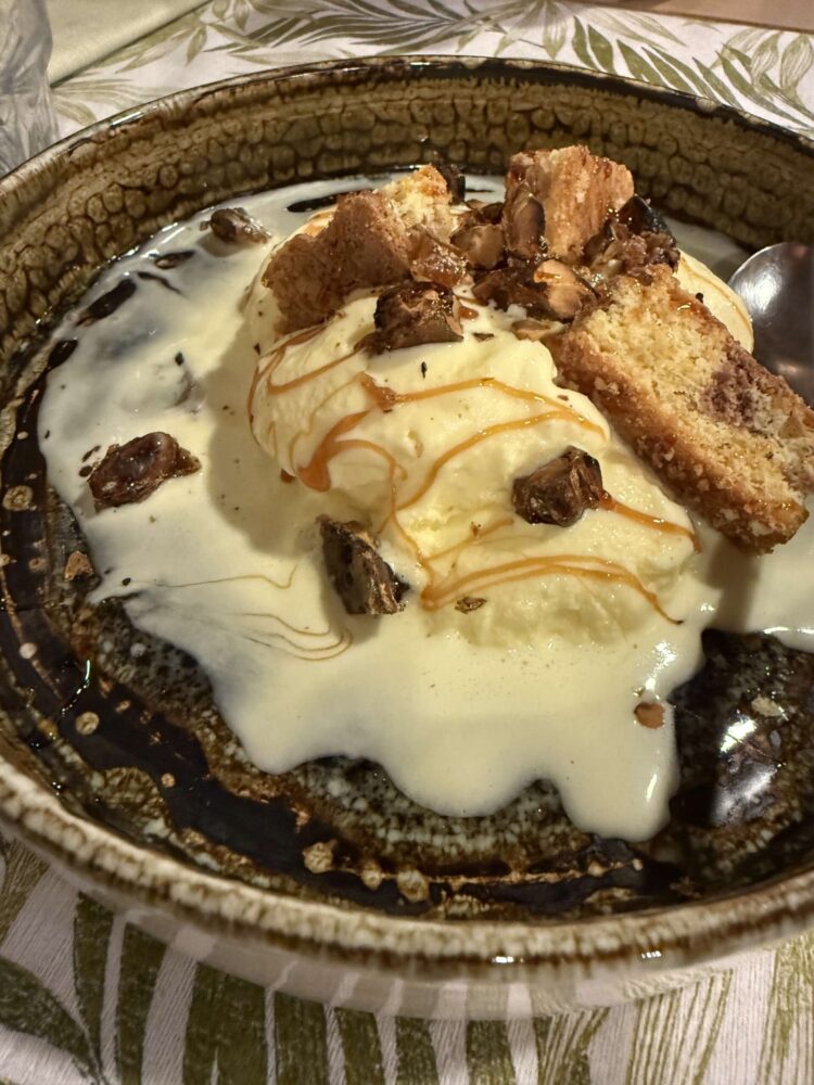 Si chiude con un dolce d’autore, un pan di Spagna caldo accompagnato da gelato alla vaniglia e pistacchi caramellati, una coccola che unisce delicatezza e carattere.