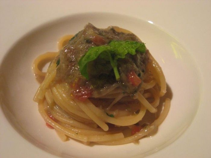 Spaghetti con cipollotto e peperoncino di Aimo Moroni del ristorante Il Luogo di Aimo e Nadia a Milano