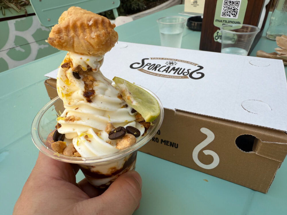 Per concludere, anche se avremmo voluto continuare con le altre versioni salate, non poteva mancare lo “Sporcaccino”: un cremoso gelato avvolto da un bollente caffè espresso, mandorle tostate, scorzetta di lime, con un mini Sporcamuss croccante. Personalmente, mi è sembrato di rivivere il celebre caffè speciale di Polignano in questo dolce.