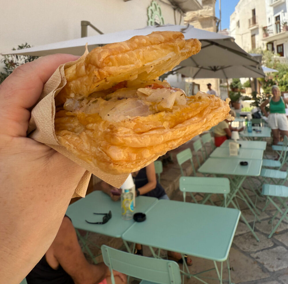 Sporcamuss, questo il nome che richiama il dolce tipico pugliese. Il nome deriva dal fatto che sono talmente pieni di crema che, per forza, ci si sporca almeno il naso o la bocca — e anche per via della sfoglia croccante che, dopo il primo morso, esplode letteralmente, spargendo gusto e disordine in ogni direzione.