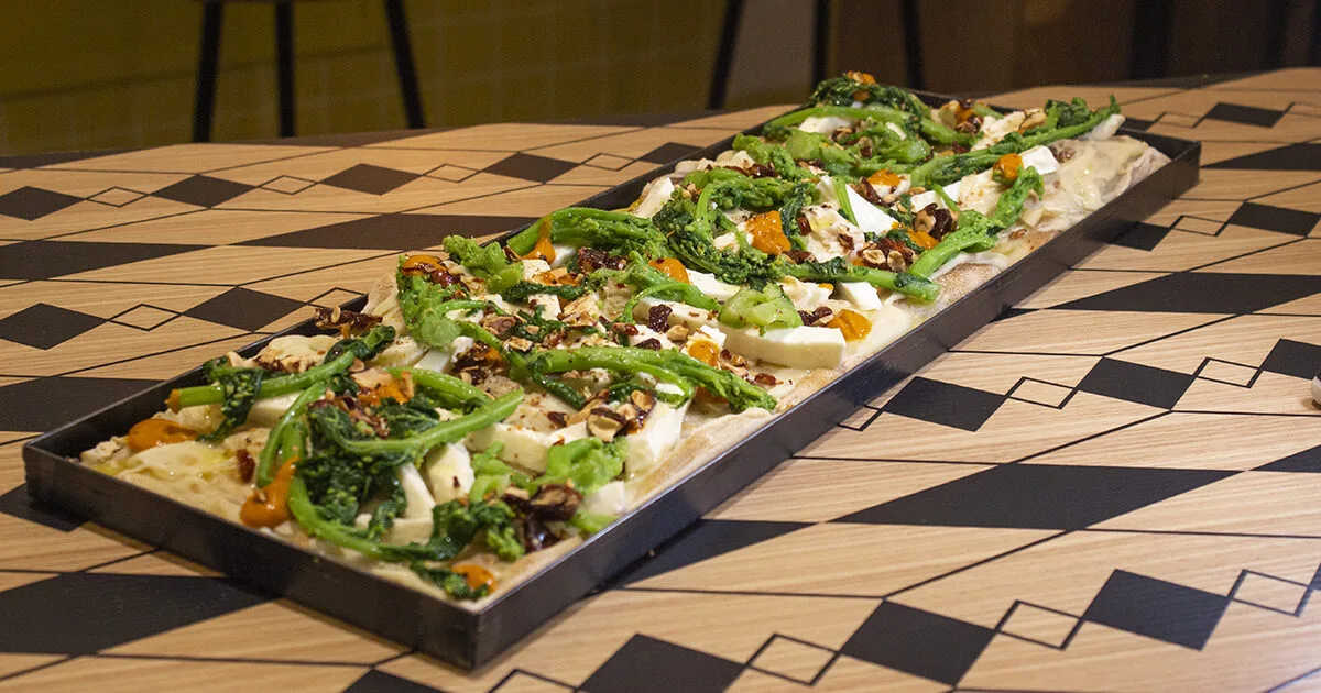 L’idea di questa ricetta nasce con l’intento di valorizzare al meglio il mondo vegetale, trasferendo alcune ricette povere salentine sulla pizza in teglia. Si tratta di antiche ricette che raccontano le tradizioni salentine, reinterpretate per l’occasione. Alla base della pizza troveremo una purea di fave essiccate, successivamente la provola affumicata di Latteria Sorrentina, delle cime di rapa sbollentate e saltate in padella, una salsa BBQ di “pimmidori scattarisciati” e, infine, “copeta” di mandorle per dare croccantezza.