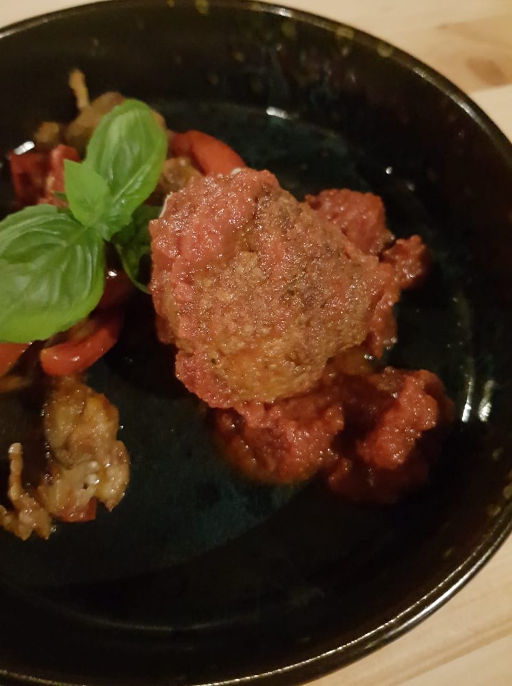 Ero troppo piena per il secondo, ma non ho potuto fare a meno di assaggiare le polpette al sugo con melanzane a funghetto.