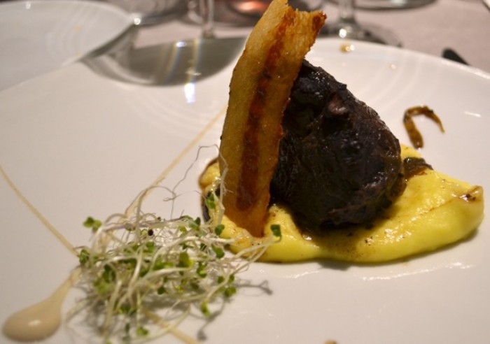 Trento Doc Riserva 2008; il primo piatto Tagliolino al Ragù Bianco di Vitella su Crema di Pastinaca al Cuveè Sot Sas 2011; il secondo piatto Guancia di Manzo su Purea di Patate con Castagne e Guanciale Croccante con il Pinot Nero Maso Cantaghel 2010 e