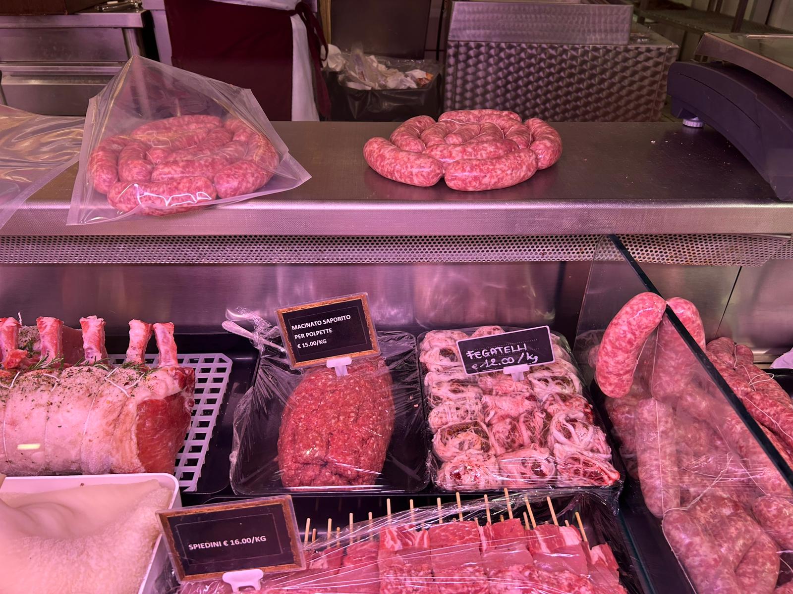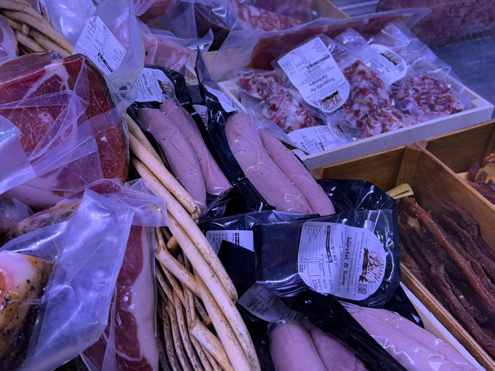 Come dicevamo, alla macelleria Belli la carne di suino, esclusivamente di cinta senese, occupa un posto di assoluta importanza, sia fresca – straordinarie le salsicce e le bistecche di capocollo – che sotto forma di salumi.