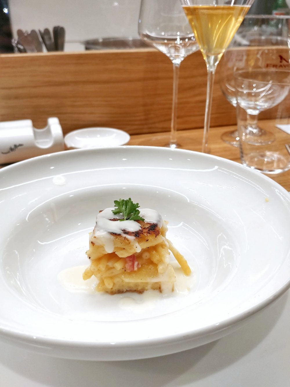 La cena in questione è principiata con una amuse-bouche che di fatto consisteva in una frittata di maccheroni con fonduta di provola, cui è seguito lo “zito rotto a mare”, con ragù di mare. Con la prima, è stata proposta in abbinamento la “Fravort di Cantina”, mentre con la seconda la “Bionda del Brenta” e il Don Andrea Bianco.