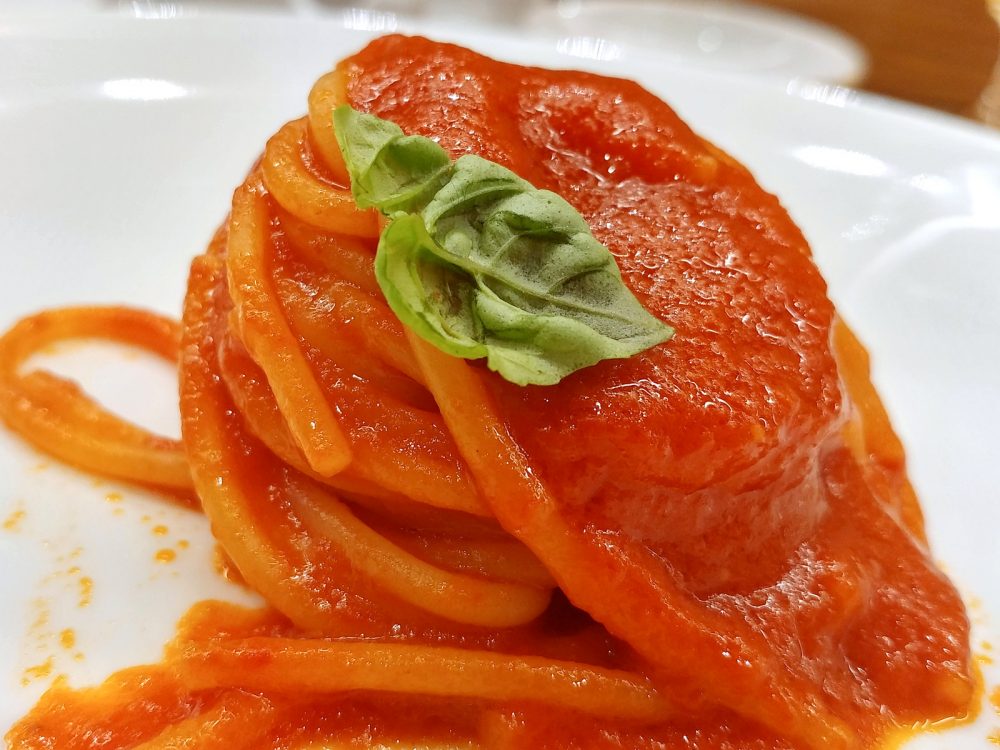 Non poteva mancare, ovviamente come pre-dessert, la Devozione. Solo spaghetti, olio, pomodoro, aglio e basilico: l’elogio della semplicità e dell’immediatezza.