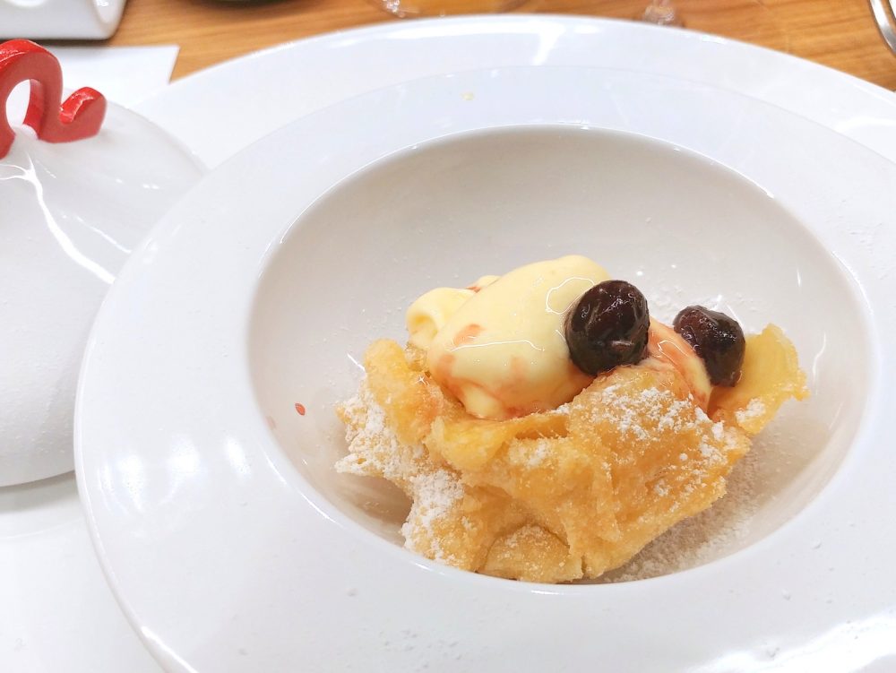 Il dessert vero e proprio, invece, è stato un conchiglione ammantato dalla pastella delle zeppole di San Giuseppe. Tale guscio è stato fritto, spolverato con zucchero a velo e servito con crema fredda, Navan e amarena. Il risultato è stato gradevole.