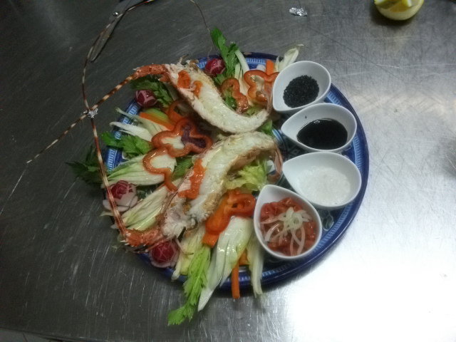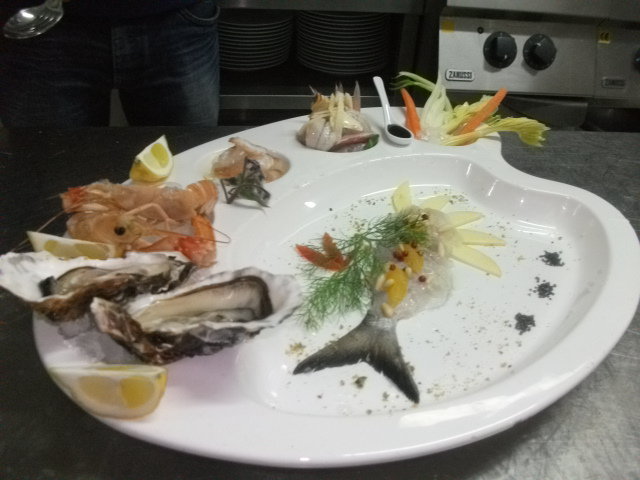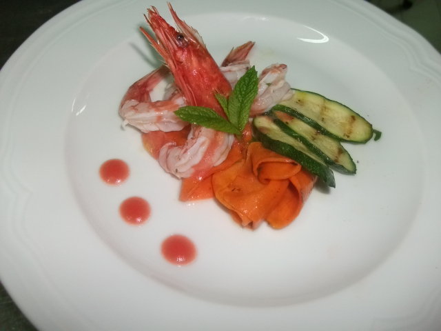 Il tutto a 25 euro. Però, come al solito ho lasciato fare, ed ecco che mi hanno servito come antipasto delle cruditè del pescato del giorno (gamberoni, scampi, scorfano e coccio) accompagnate da verdura e frutta di stagione oltre a degli sfizi di mare (crostino con calamarelle scottate alla piastra e pomodorini, bocconcini di tonno al pistacchio e semi di papavero, filetto di sgombro in foglia di limone).