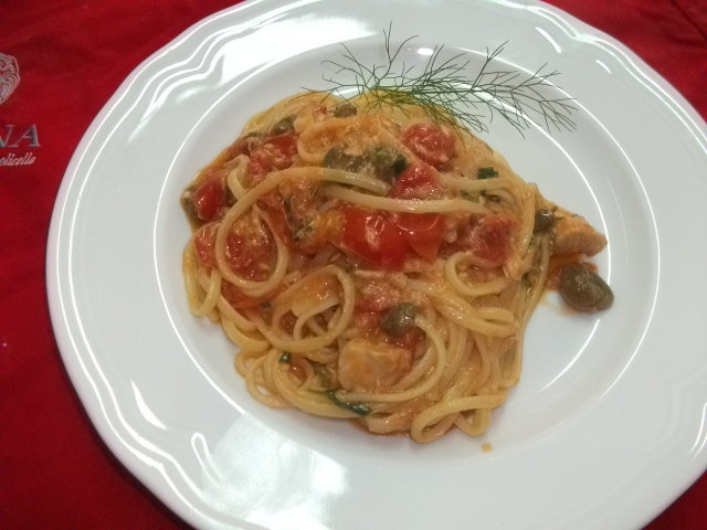 A seguire delle squisite linguine con tonno e pomodorini (da segnalare che il tonno, le alici di menaica e l’olio sono di produzione propria e vengono anche commercializzati nel locale) .
