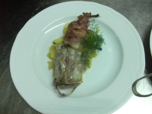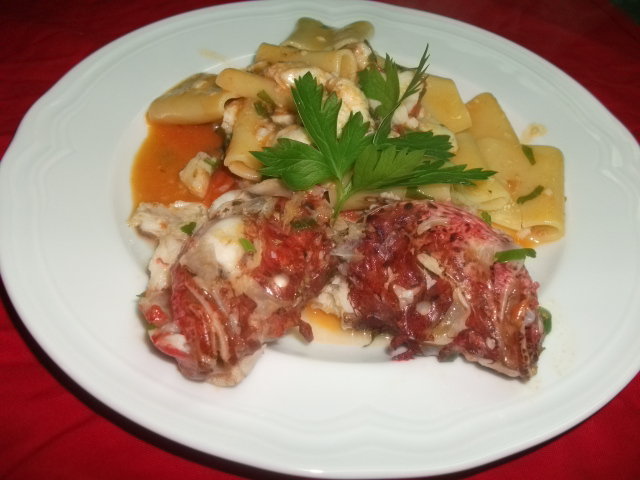 Come secondo una pezzogna alla mediterranea (con patate, pomodorini, olive e basilico).