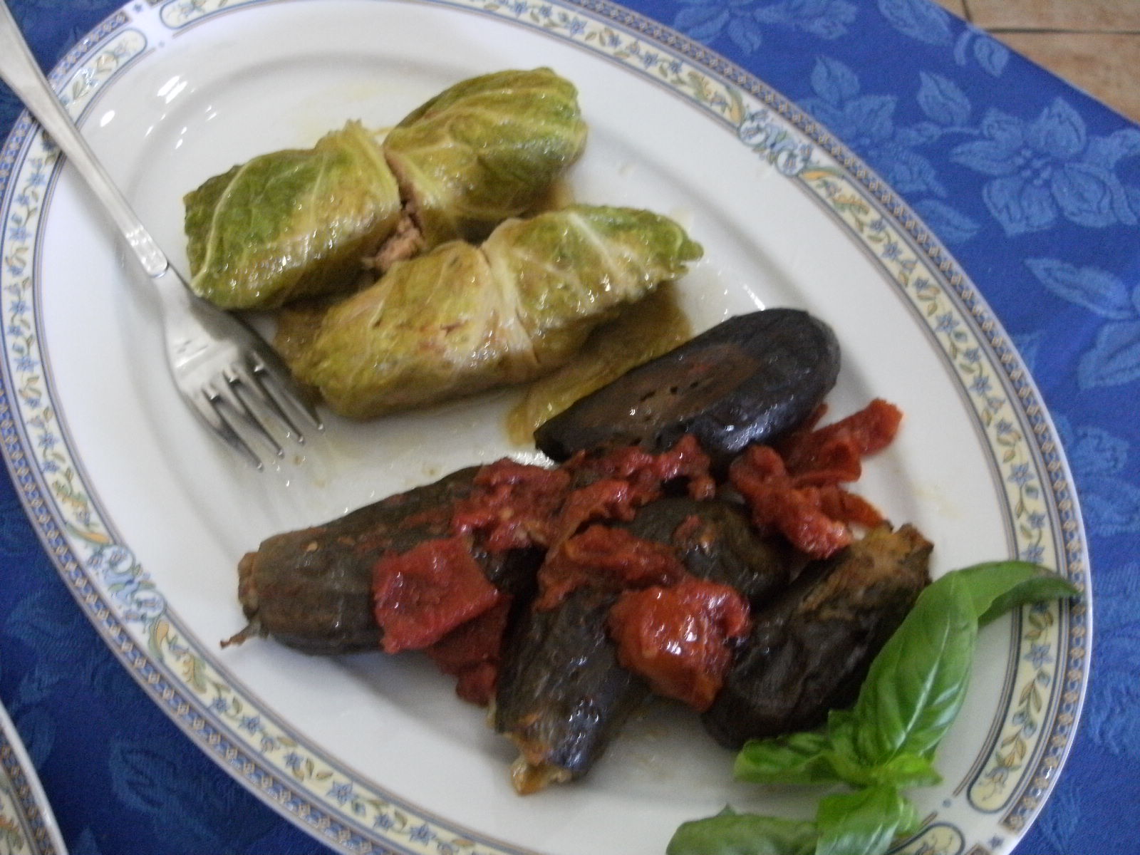 Secondi piatti: coniglio all’aroma di pepe rosa, con contorno di patate al forno arreganate e olive, cicorie di campo con patate, fagioli e ceci in purezza conditi con olio extra vergine di oliva; involtini di verza ripieni di carne e contorno di melanzane al pomodoro.