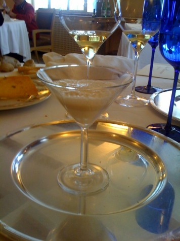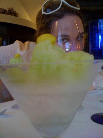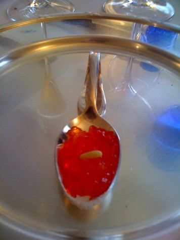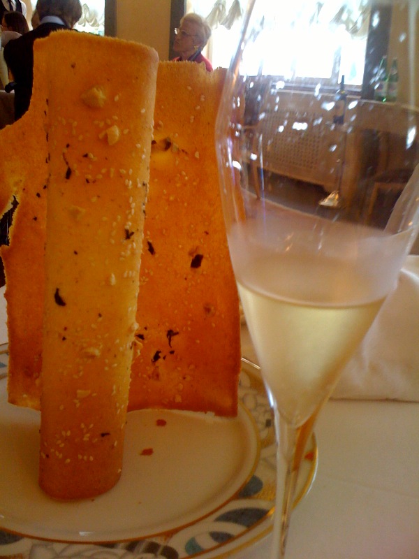 Un’aleatico salentino e un muffato di Antinori aprono la sequenza del dessert assieme a un vassoio di biscottini. Stupisce il bicchiere dove galleggia nel vuoto la “granita di mela verde, assenzio e crema d’olio”. In realtà con tanta pazienza nel bicchiere era stato “costruito” un cono di ghiaccio vuoto (ritorna l’alchimia) che si rompe al contatto con il cucchiaio e dà corpo alla granita che è quasi una “grattachecca”.