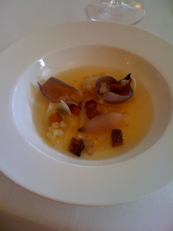 Il piatto è metafisico, nel brodo biondo l’acidulo del pomodoro si sente tutto ma non ce n’è traccia materiale mentre galleggiano alcune “barchette orientali” di cipolla, briciole di pane e dadini di rapa bianca. Il figlio dello chef ci spiega che per fare questa brodo, si centrifugano tre tipi di pomodoro in grande quantità con l’aggiunta di una punta di lime.
