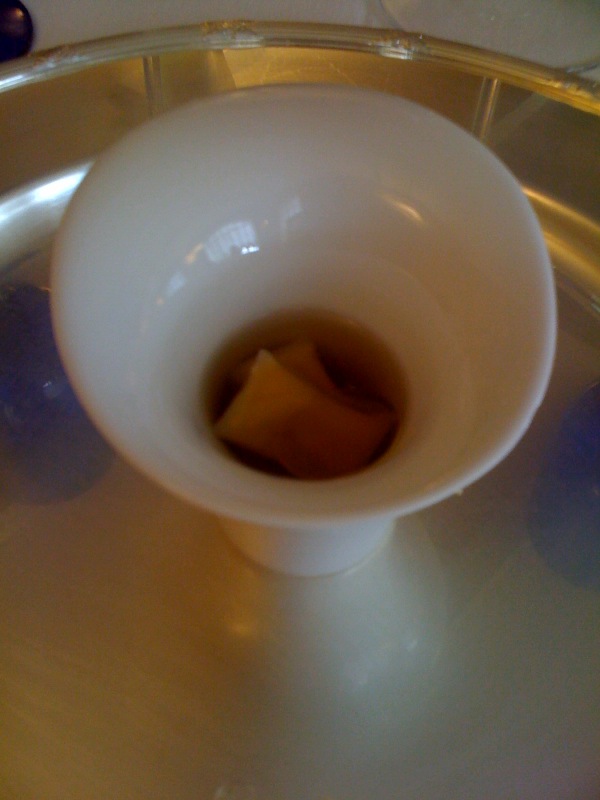 Per finire il giro, la perla di pinoli in carta di riso (un raviolino) in brodo di rosmarino.