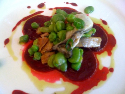 Lascia nel piatto segni pollockiani, l’antipasto tra il magenta e l’oro. E’ “rape rosse al Campari, vignarola di fave e piselli con aringa laccata”. La vignarola, nel Lazio, è un’insalata dell’orto ma in quella di Tassa si passa dal dolciastro delle fave a quello alcolico del Campari fino al salato dell’aringa, in un gioco di contrasti esaltato dal gusto di “pera sciroppata“ del Riesling di Elena Walch (l’annata non me la ricordo…mica sono un critico!?) che intanto era finito nel nostro bicchiere.