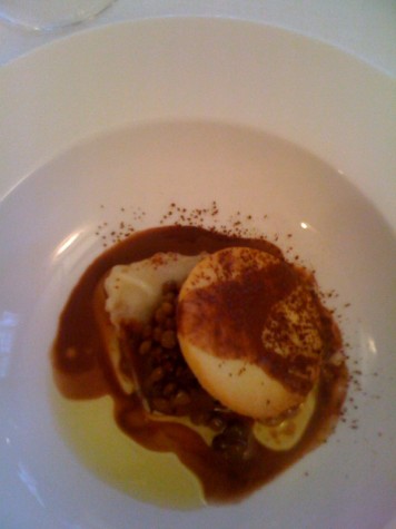 A raffica passiamo alla “lasagna ai profumi di terra”, un’unica sfoglia di pasta ripiegata su se stessa in ragù di agnello dove l’acidulo del pomodoro riprende a giocare con il dolciastro della mozzarella di bufala, trasformata in crema. Ma il massimo della sorpresa sono i “ravioli di pecorino liquido”. La pasta è tesisissima ed esplode in bocca (fa “pop” l’ho giuro, l’ho sentito) lasciando andare il suo contenuto di formaggio che – si racconta – sia stato lavorato a mano per un’ora e mezza fino a diventare cremoso.
