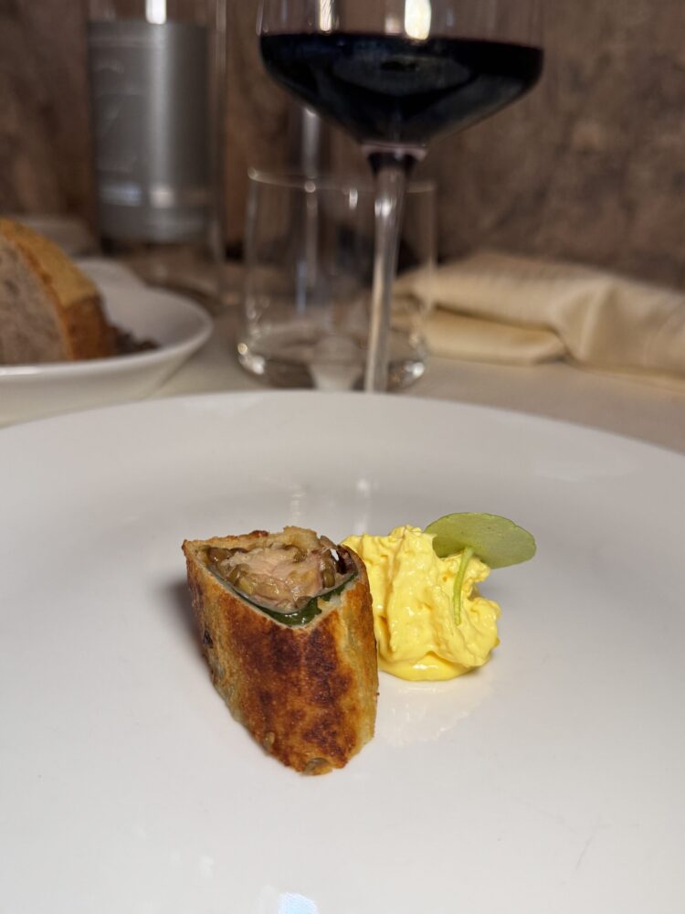 Mare e lago protagonisti dell’entrée: anguilla del Trasimeno, patè di tinca e carpaccio di pesce spada, accompagnati da pane e olio umbro appena franto della storica azienda Decimi. Straordinaria la focaccia con prosciutto di Cinta Senese 24/30 mesi di stagionatura e fico sciroppato, unico elemento di terra.