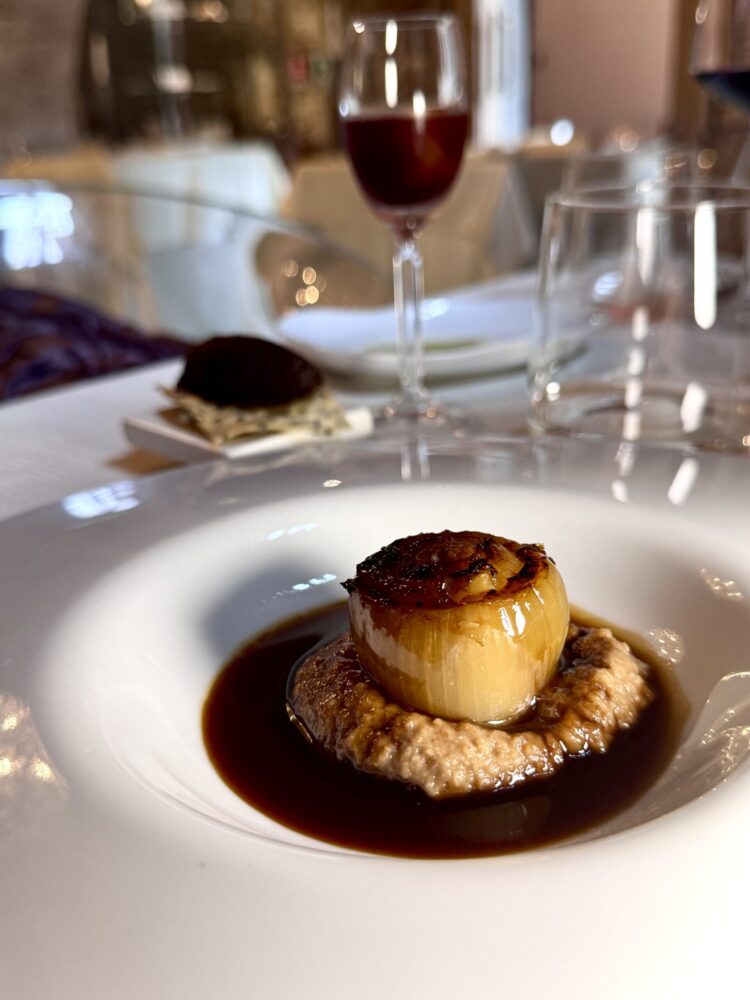 Di grande tecnica il petto d’anatra con sedano rapa bruciato e prugna latto-fermentata. Le fermentazioni, che ritroveremo nella indimenticabile cipolla di Cannara fermentata nella cera d’api, sono l’asso nella manica dello chef.