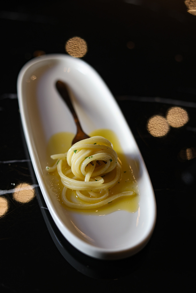 Curioso e spiazzante il pre-dessert: uno spaghetto aglio e olio che prepara il palato alla chiusura.