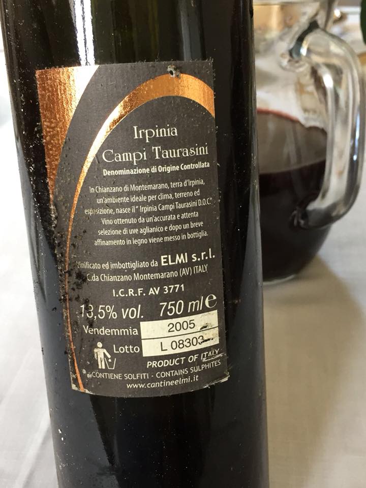 Becco questa bottiglia di Elmi, una piccola azienda di Montemarano che ha bei vigneti in Contrada Chianzano e stappiamo senza problemi questo 2005. Lo mettiamo per prudenza in una brocca prima di servirlo.