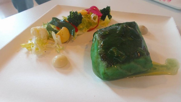Deliziosa e raffinata l’ostrica in gelatina di Campari in antipasto e per secondo baccalà al vapore in verde di minestra maritata.