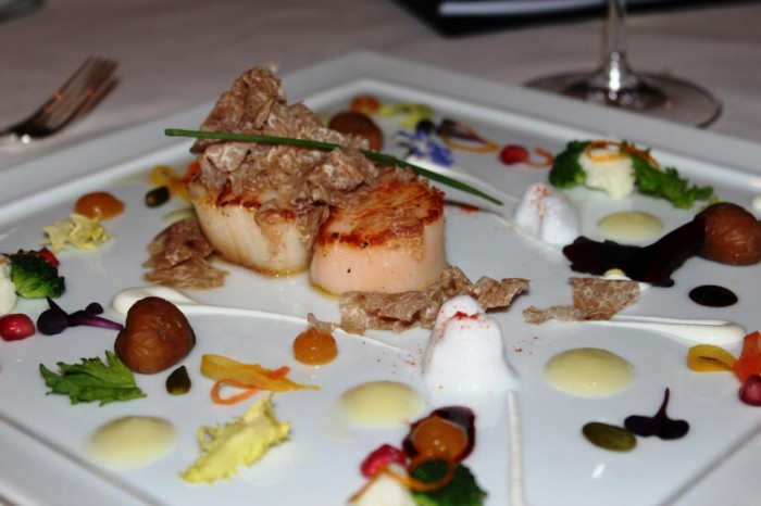 le capesante con noci marinate alle erbe spontanee servite con caprino fresco giardino autunnale tartufo e salsa alla mela verde