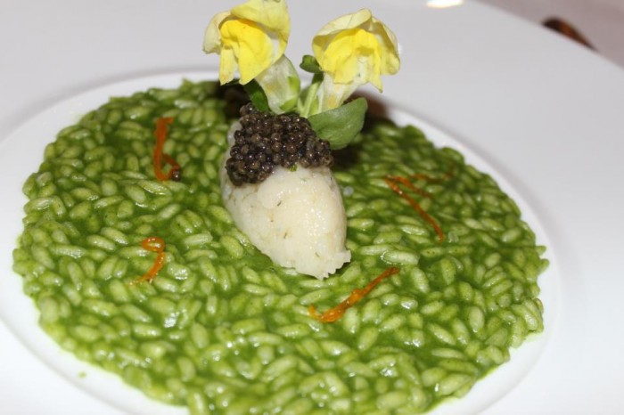 Riso mantecato con fondente di verdure di minestra maritata ascè di seppie mandarino candito e caviale Asedra